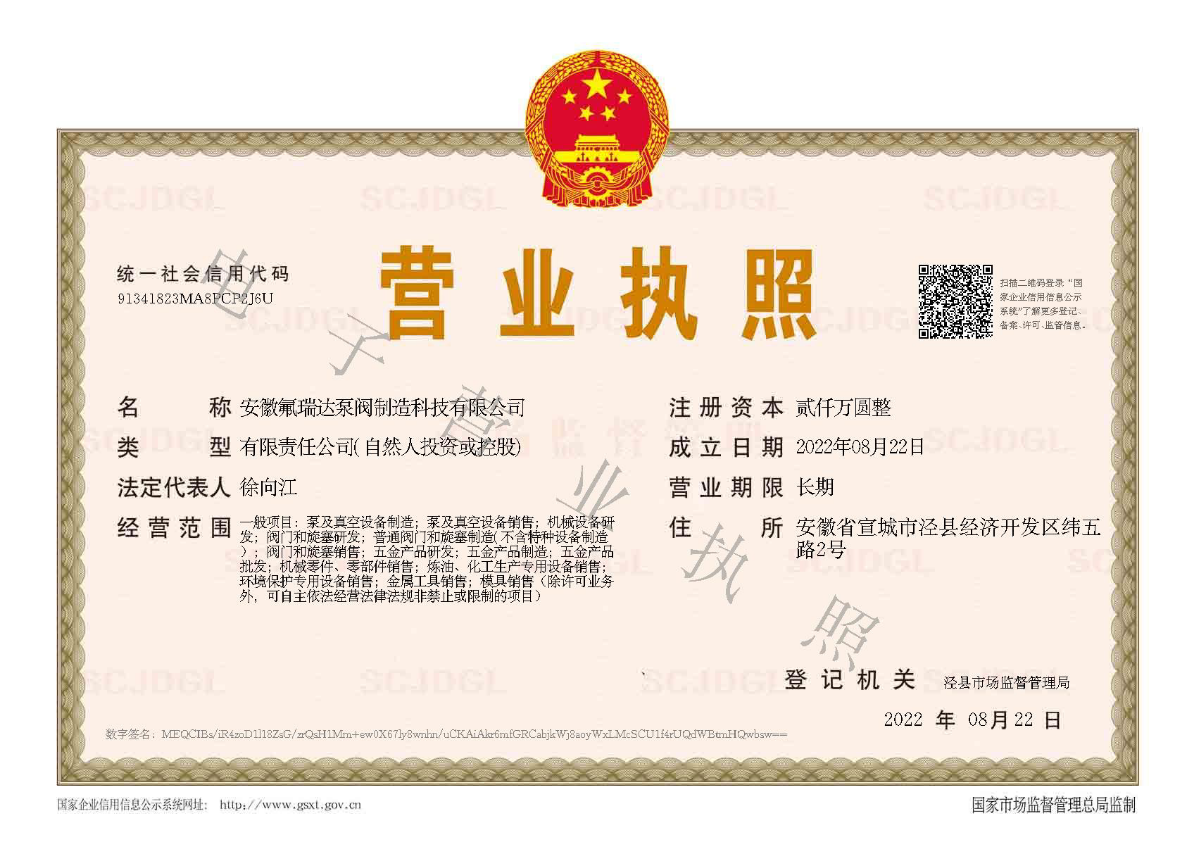 - 安徽氟瑞达泵阀制造科技有限公司 INTRODUCTION 安徽氟瑞达泵阀制造科技有限公司是一家致力于化工泵生产,研发,销售,服务为一体的技术型生产厂家。公司位于安徽省宣城市泾县经济开发区纬五路2号,占地面积18009平方米。 主要产品包括氟...